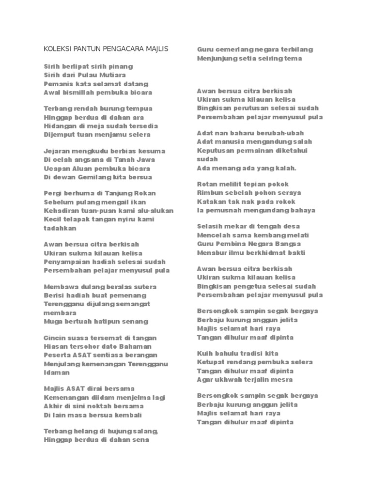 Di bawah ini saya tuliskan contoh dari kata sambutan rapat pertemuan. Hari Jumaat lepas aku jadi pengacara majlis lagi untuk kesekian kalinya. Malam raya duduk bermenung Air mata jatuh berjurai.